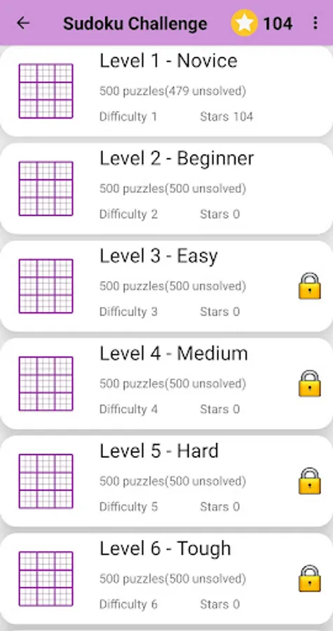 The goal of a sudoku puzzle is to fill the cells with numbers from 1 to 9 so that each number is only used once in each row, each column, and each small square. The game is designed in challenge mode. You need to collect stars to unlock next level.