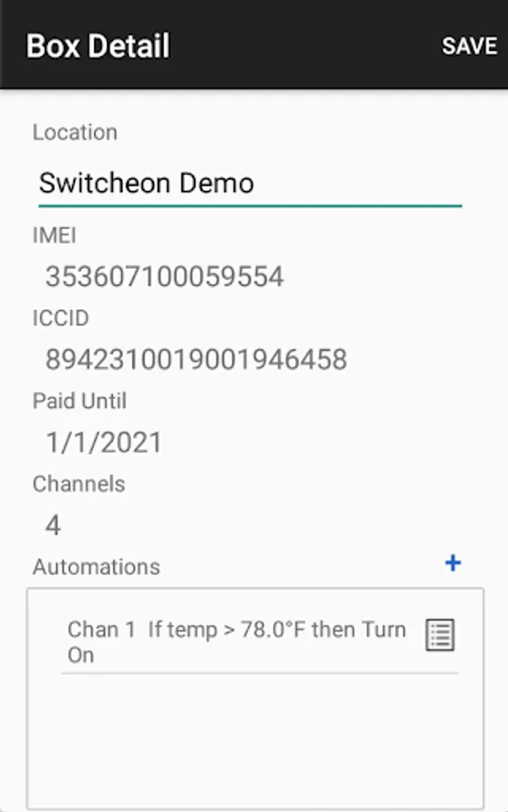 Cellular remote power control and programming of device automations based on time, date or temperature for up to 4 channels. For use with the SwitcheOn remote power control boxes available at https://www.switcheon.com
