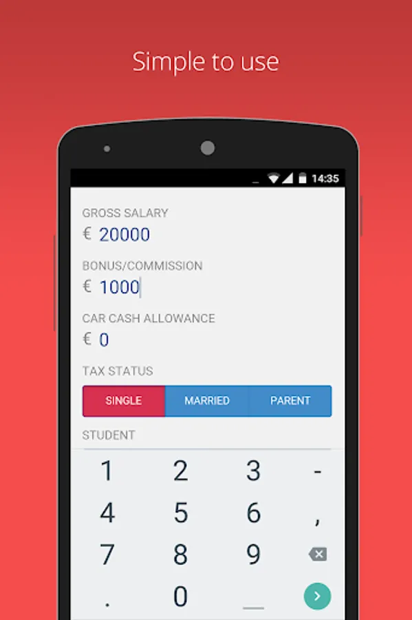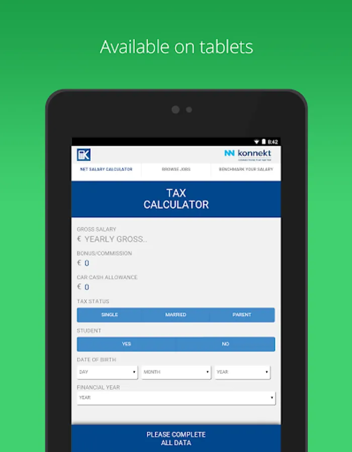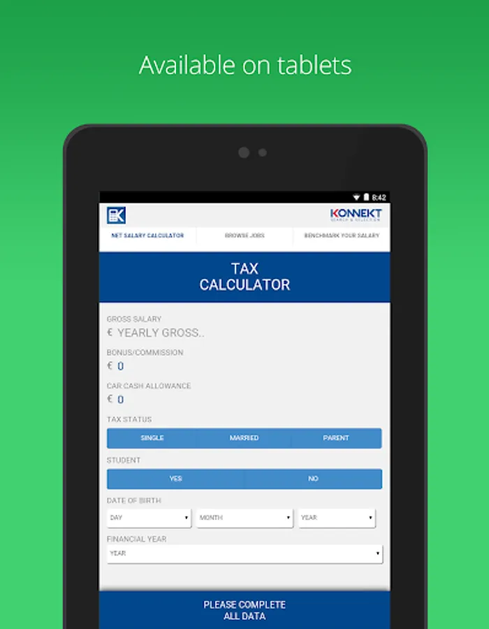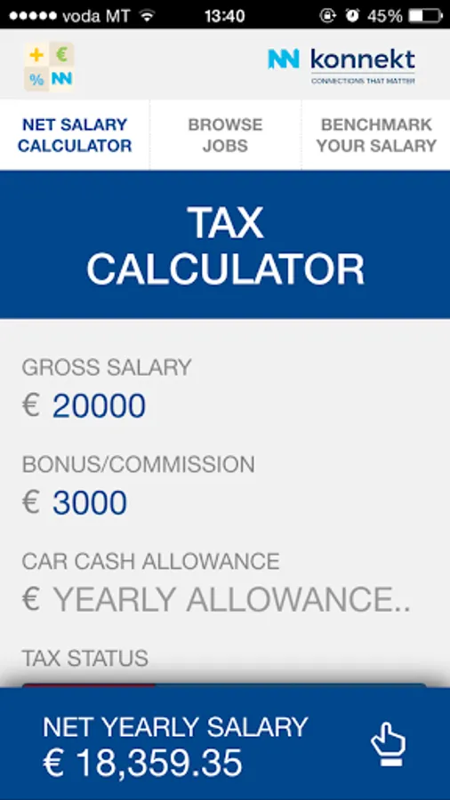 KONNEKT Malta Tax Calculator allows users to calculate their net salary, income tax and social security contributions by inputting their gross salary and any additional cash benefits. This app uses the latest data from the Inland Revenue Department in Malta, Europe, to calculate the net salary. The Malta Tax Calculator provides data distributed into the following categories: