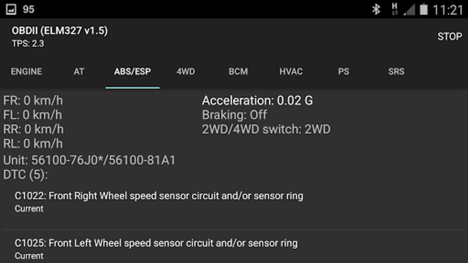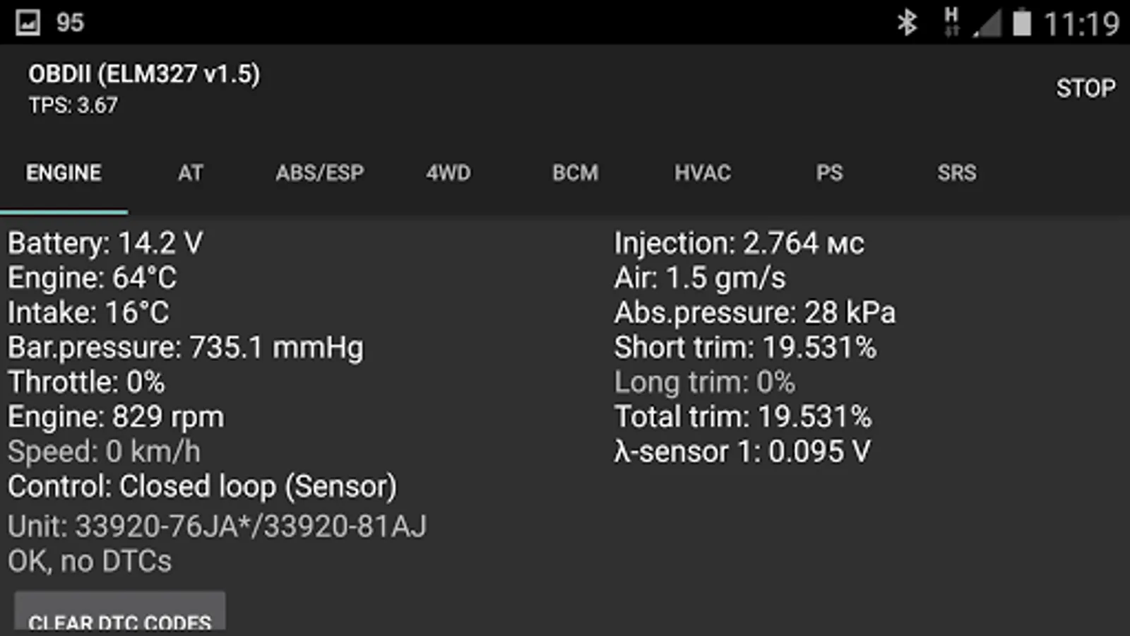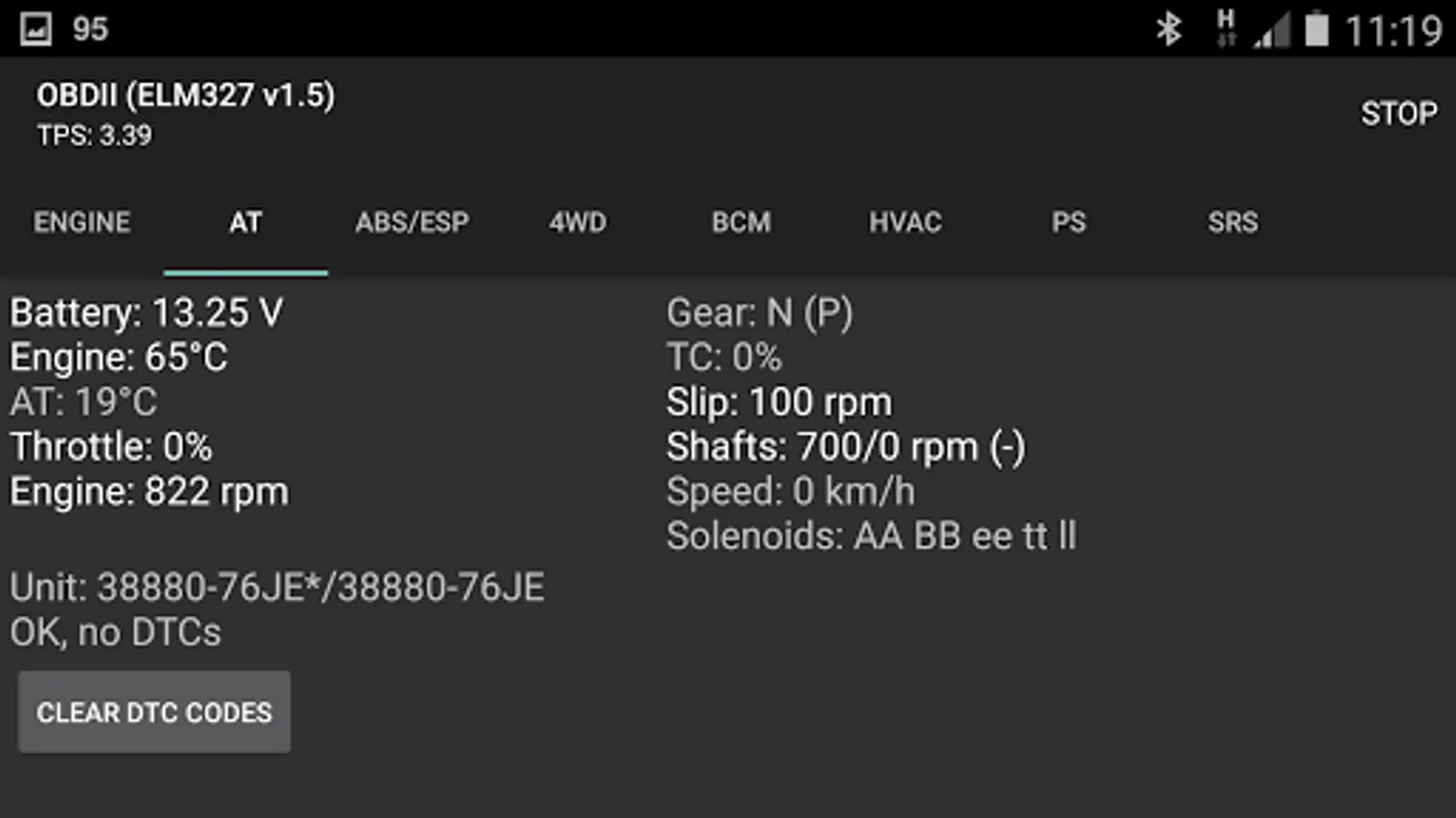 This application allows you to view and reset DTC errors for various control modules: powertrain, engine, AT/CVT, ABS/ESP, SRS, AC/HVAC, BCM, PS, EMCD/4WD/AHL, TPMS, etc. However, not all modules may be present on a tested vehicle.
