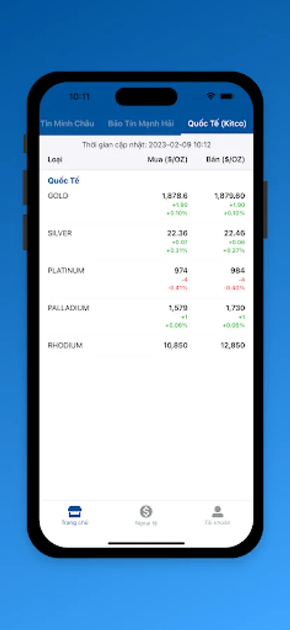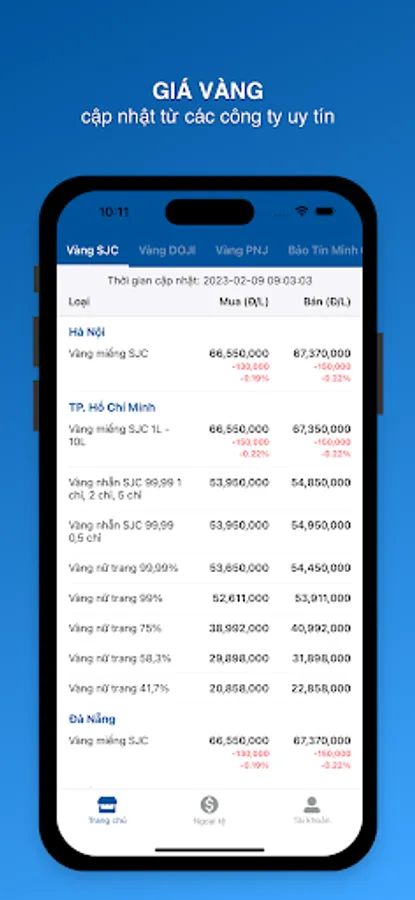 - Most reliable (from SJC, DOJI, PNJ, Bao Tin Minh Chau, Bao Tin Manh Hai, Kitco, Vietcombank, VietinBank, BIDV and other big banks)