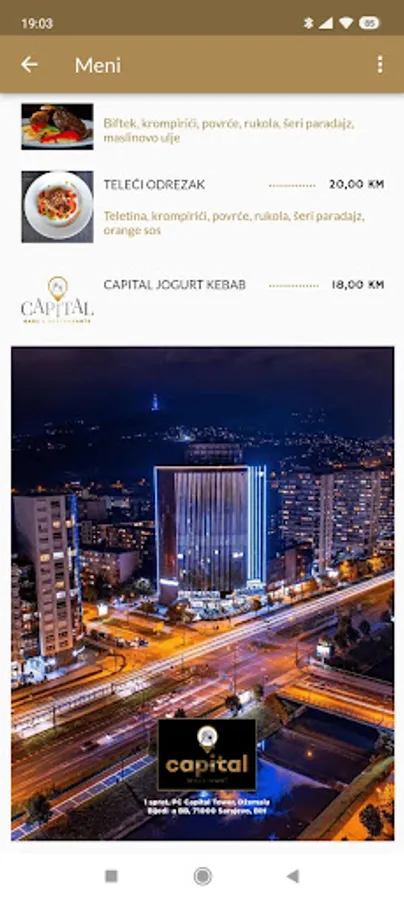 Ako ste u potrazi za ukusnom hranom, pripremljenom s puno ljubavi, na pravom se mjestu. U ovom malom gastronomskom kutku u srcu Sarajeva, na usluzi Vam stoji tandem sa dugogodišnjim iskustvom, strečenim u nekoliko renomiranih sarajevskih restoran. Ono po čemu se izdvaja naša kuhinja je mješavina različitih vještina kuhanja i egzotičkih začina koja neće ostaviti ravnodušnim ni najveće gurmane. Gostolubivost, slasna hrana, lijep ambijent, sve na jednom mjestu. Capital Bars & Restaurants se nalazi na adresi Džemala Bijedića BB, 71000 Sarajevo, PC Capital Tower, 1. sprat.