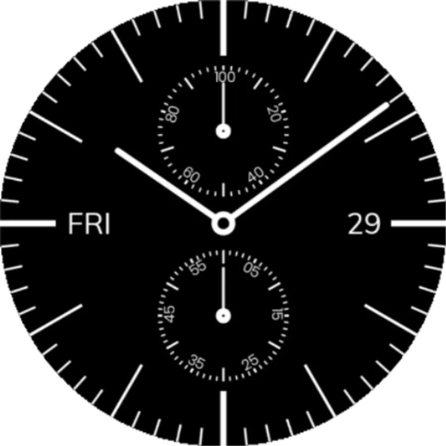 Timeless design showing watch battery on top dial and seconds on the bottom one.