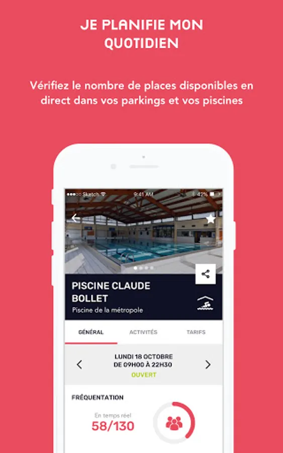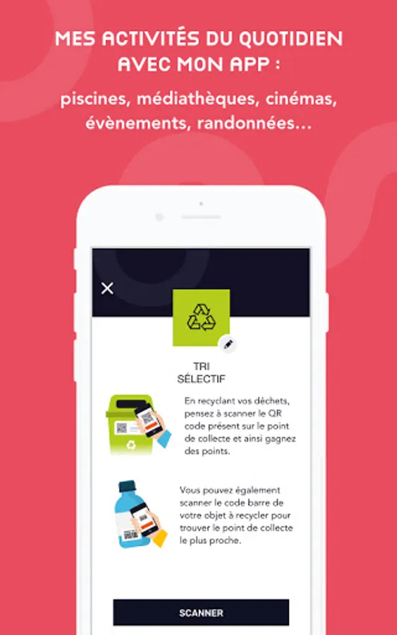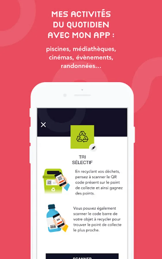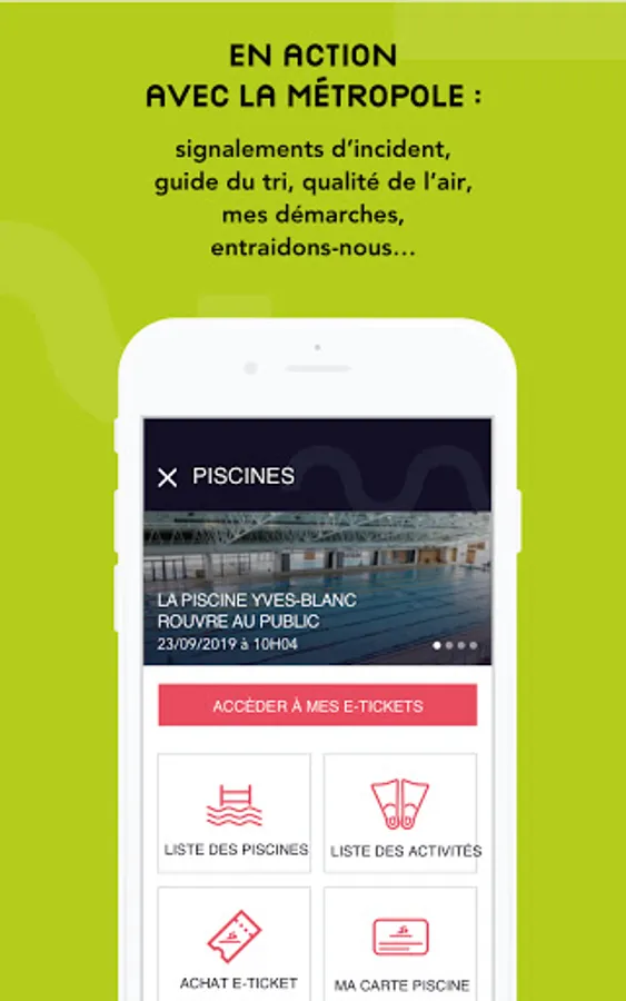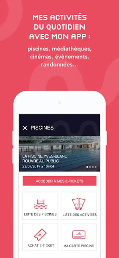 • Live my daily activities with my application: my swimming pools (shop, timetables and attendance), my media libraries (schedules, catalog and loans), cinemas, events, hiking trails, cultural and sports activities, etc.