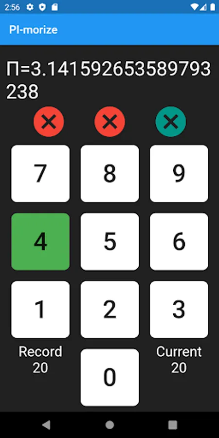 Test your ability to remember the digits of Pi. Helps memorizing pi