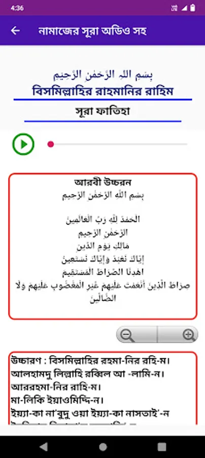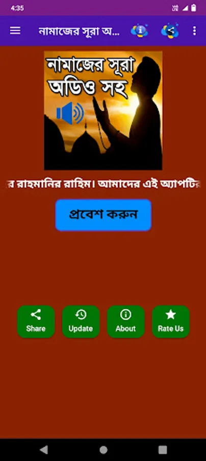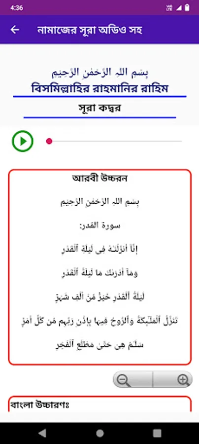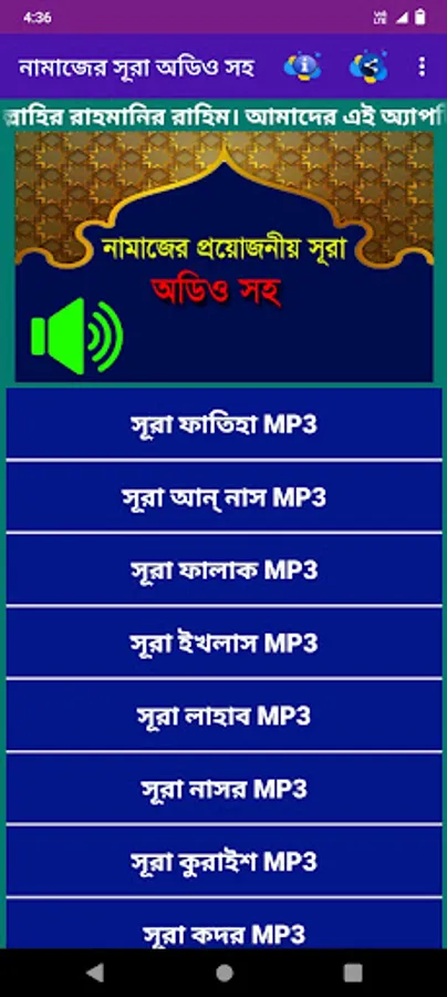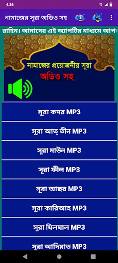 আপনারা এই অ্যাপটির মাধ্যমে নামাজের সকল সূরা অডিও সহ শুনতে পারবেন। ইবাদতের মধ্যে সবচেয়ে গুরুত্বপূর্ণ ইবাদত হচ্ছে নামাজ বা সালাত । মহান আল্লাহকে রাজি খুশি করতে আমাদের অবশ্যই নামাজ আদায় করতে হবে। মুসলিম হিসেবে আমাদের নিয়মিত পাঁচ ওয়াক্ত নামাজ আদায় করা উচিত। নামাজের সকল সূরা গুলো আপনারা যাতে সহিহ শুদ্ধভাবে শিখতে পারেন সেজন্যই আমাদের অ্যাপটিতে নামাজের সকল সূরা গুলো অডিও সহ অর্ন্তভূক্ত করেছি।