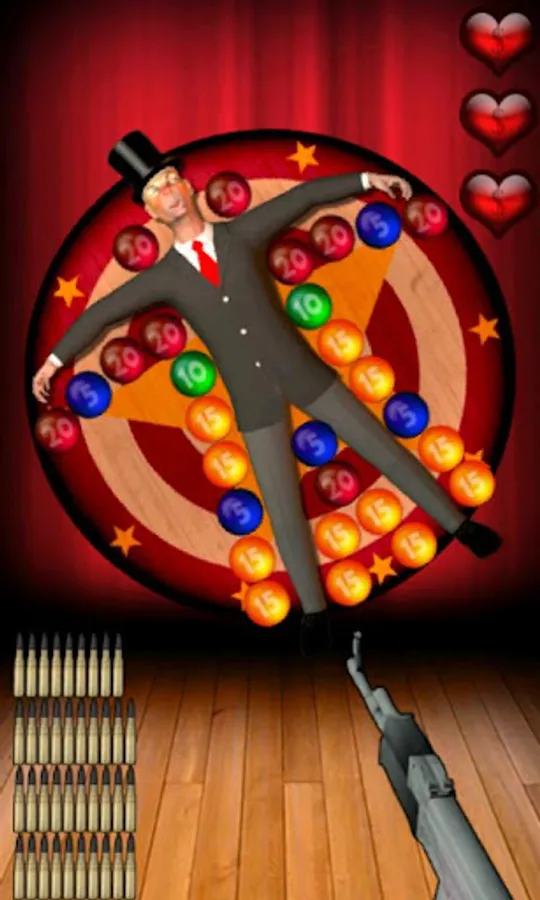 Pitch: Harold was a famous banker from 'Soldman & Lacks'. As a good banker, he invested at risk and lost the money of the poor people. Harold was caught and now he must reimburse. Do Not Kill the Banker or you will never see your money back. Shoot the Balloons and earn more money in order to get new Weapons for Free. Be careful, if you hurt or kill the Banker you will loose your credits. Be accurate and you will earn more credits...