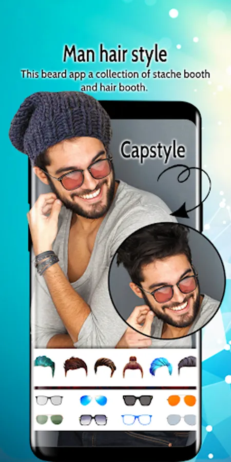 You will feel absolutely lucky using Man hairstyle photo editor, this advanced hair changer gives you a real chance to get an instant attractive new look , This man hairstyle pro includes a large variety of stylish stickers we keep in mind that the stickers offered by this photo editor are uncountable we will try here to point out just those which are look important to mention like :stylish collection of haircuts such us Spiky haircuts, Curly haircuts , regular haircuts… , Cool bundle of Beards & Moustaches stickers , also with men hairstyle app you can decorate your pictures with a numerous kind of tattoos and some trendy brands of glasses stickers , also you can apply many comic stickers of Boom , dust , cloud , wow stickers , as well this photo editor allows you to add a lot of motion stickers , and several fashionable brands of lovely cap stickers and much more to discover on this interesting photo editor .