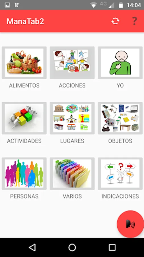 Inside the main screen are up to 9 categories. Each of these may contain up to 4 subcategories in turn, each of these up to 9 resources (image, text and speech synthesis).