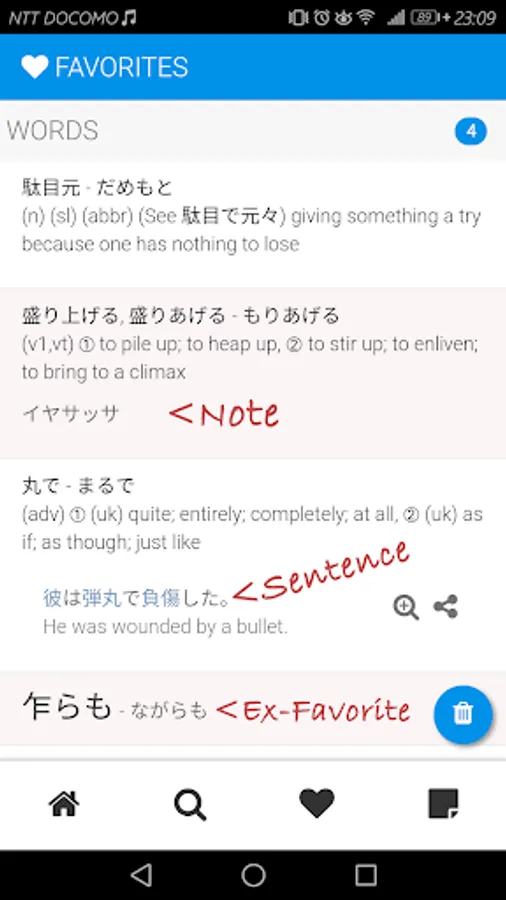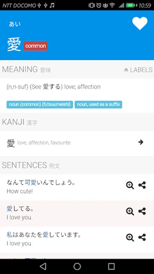 * Share word and kanji entries as well as example sentences to your favorite flash card app