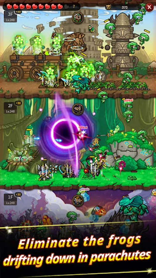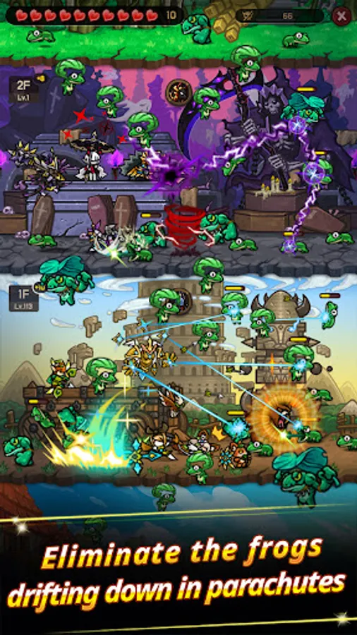 [Frog Defense], where you face off against enemies that fall from the sky and skip floors.