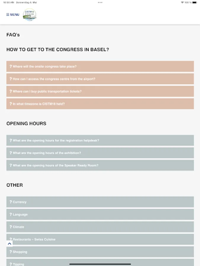 With this app, CISTM18 offers the opportunity to browse, search and view the full scientific programme. You can also create your personal schedule and view ePosters. The floor plan allows you to easily navigate the exhibition and congress venue onsite in Basel.