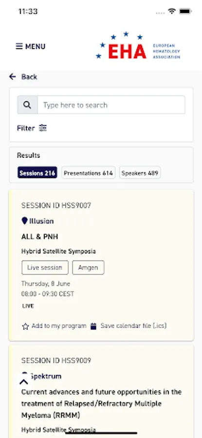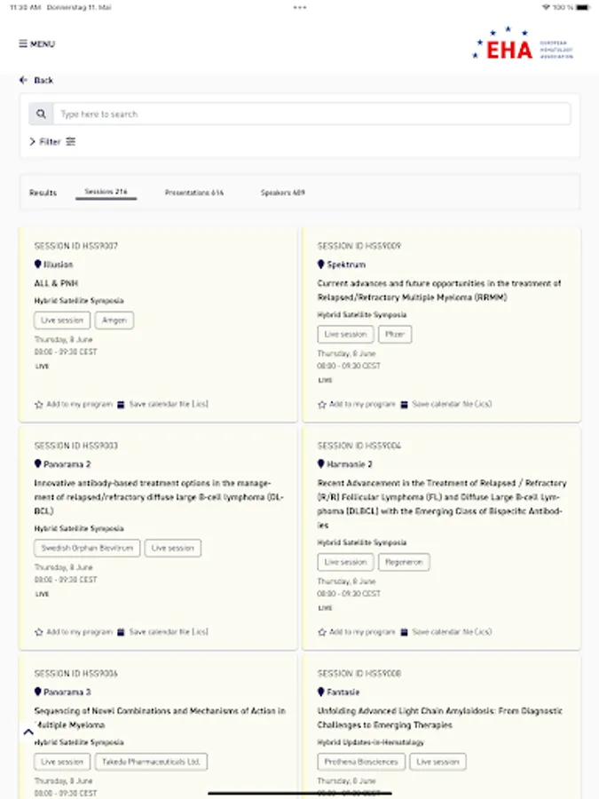 For participants who attended in Frankfurt, the Congress Mobile App is the Congress in the palm of your hands. Via the Congress Mobile App, browse the program, save sessions of your interest, find your location, access all content, and interact via the Q&A feature. For virtual attendees, the Congress Mobile App is the tool to watch all the Congress content from any device. The Congress Mobile App is there for you to follow the latest EHA2023 Congress news, receive updates about the program and view all the content.