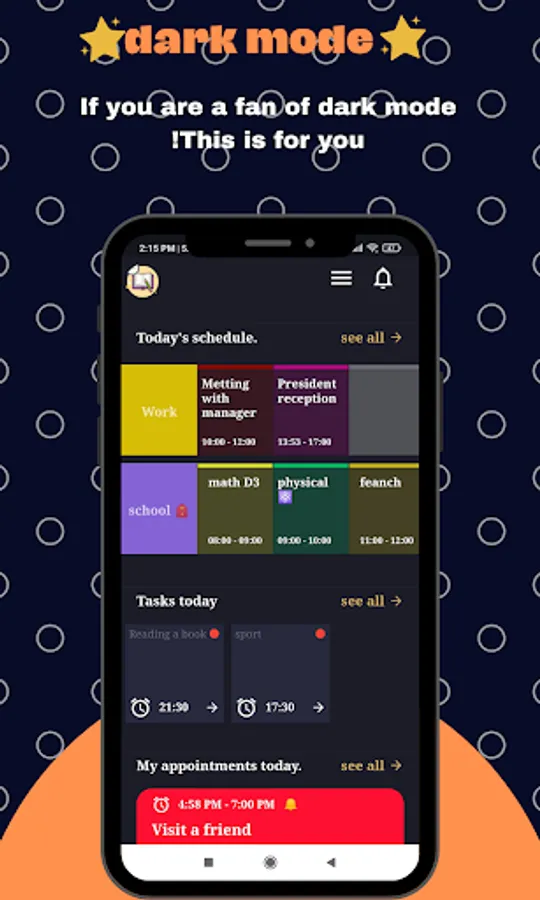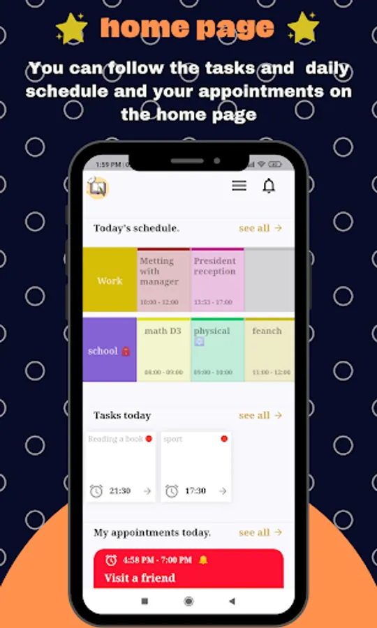 schedule planner, and daily tasks pro has everything you need in a calendar app: It provides an excellent overview of your appointments,and your tasks daily it’s easy to use and it gives you powerful tools for planning and scheduling your events and tasks.