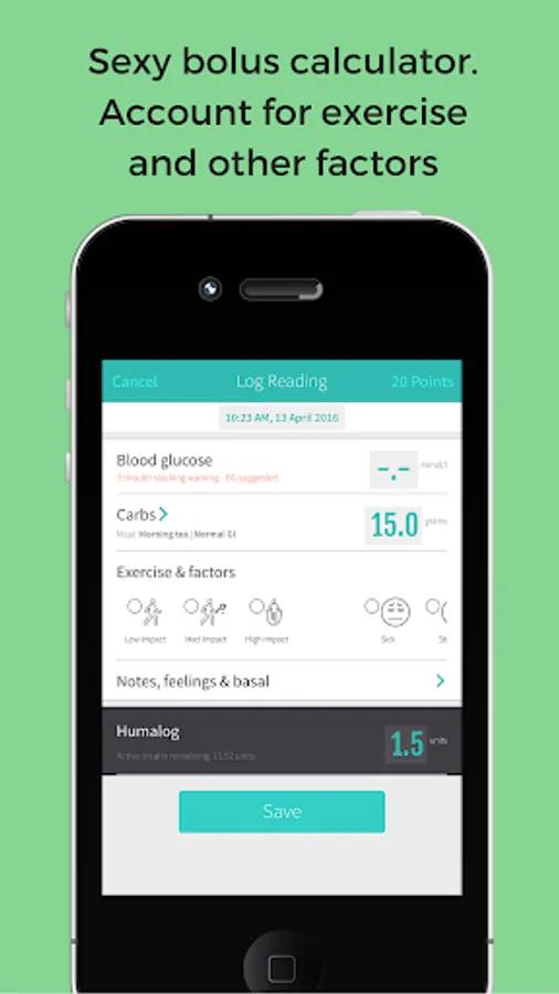 Jade calculates insulin doses, tracks active insulin to avoid stacking, and uniquely, warns of hypos hours ahead. It makes dose suggestions, reminds you of meals and basal insulin, and sounds alerts for predicted hypos and for hypo follow-up.