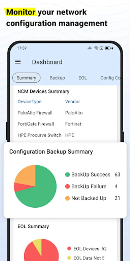 Obtain real-time updates on various network tasks, including backups, end-of-life (EOL) statuses, compliance issues, firmware vulnerabilities, and more on the Dashboard.
