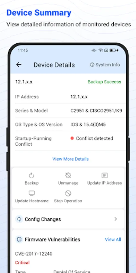Efficiently execute tasks such as reviewing configuration changes, conducting backups, resolving startup-running conflicts, updating IP addresses and hostnames, and halting device operations.