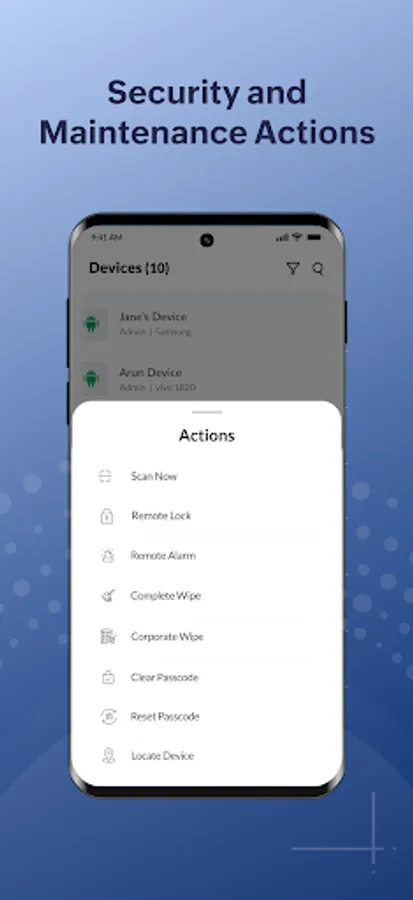 To ensure better device maintenance, you can take actions like restarting devices, clearing or resetting passcodes and remotely locking devices. Scans can be initiated on devices, to ensure undisturbed server-device contact, and the remote troubleshooting feature can help solve issues in real time.