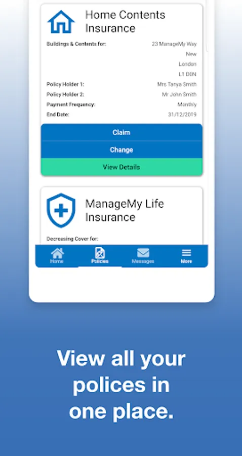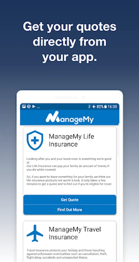Welcome to the ManageMy Insurance app, which is packed full of features designed make managing your ManageMy insurance policies a breeze. You’ll find your policy details and insurance documents within the app, and you can also access messages from us, submit a claim on your insurance and manage your personal details.