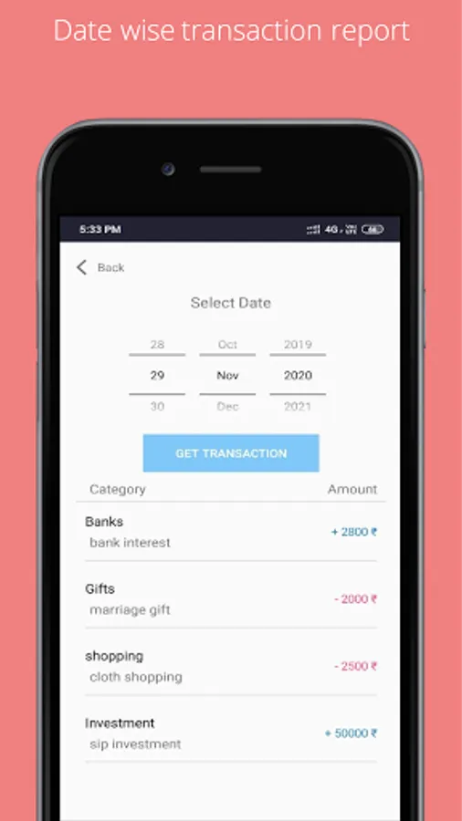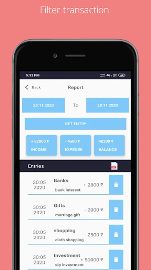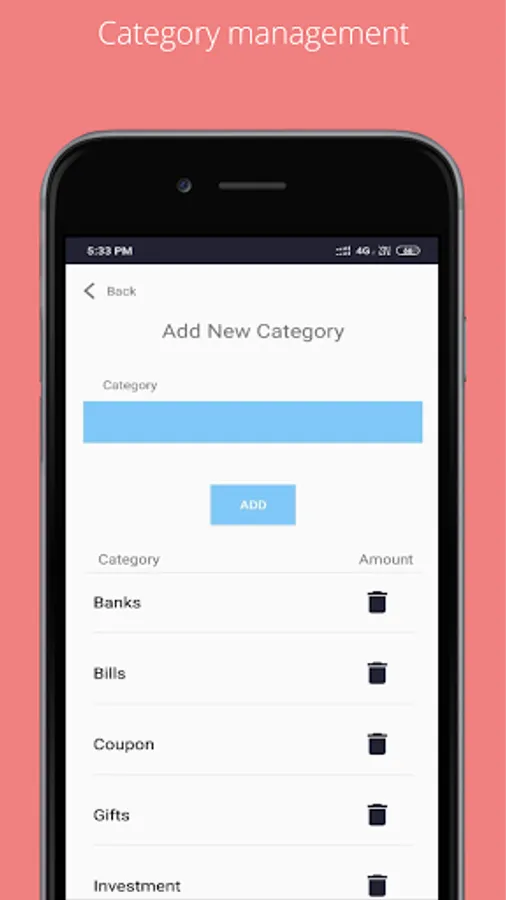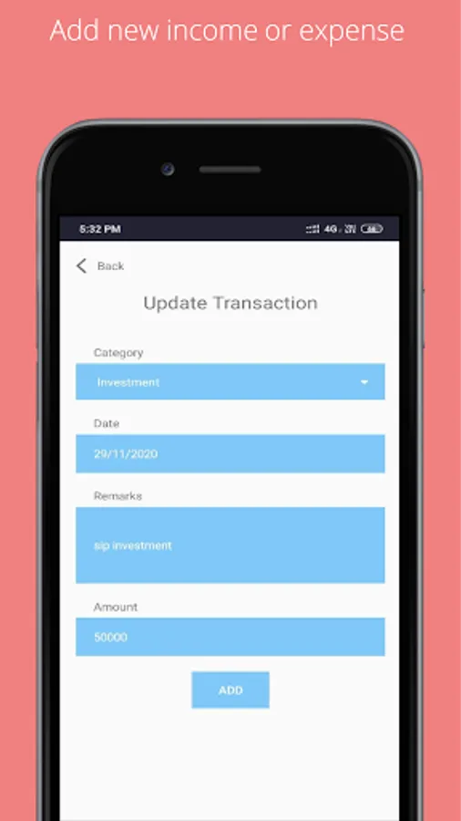 Category wise add your income or expense in app. you can also add/delete category as you want.