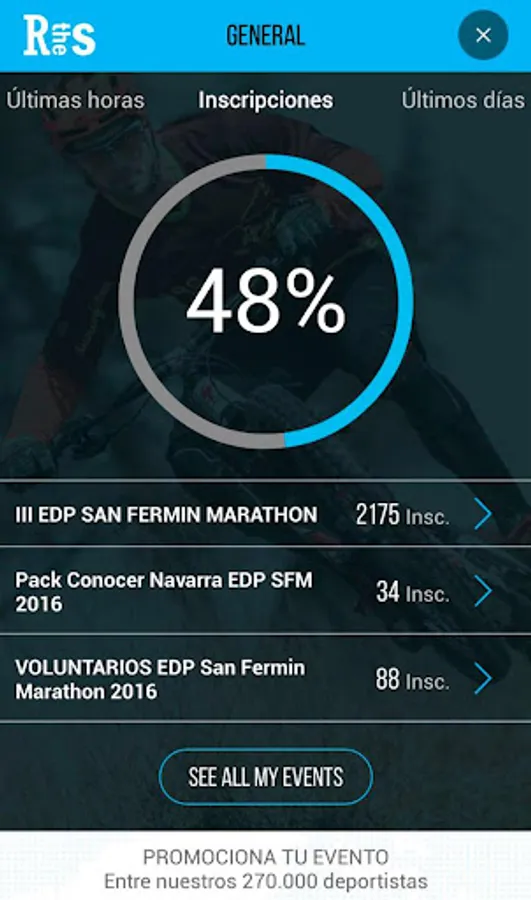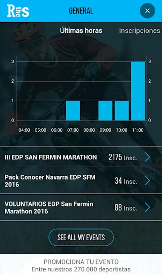 With this app you will be able to consult all of the information from your events and access to all of the stats they generate: inscriptions by day, week, month; participants by sex or age, number of people who have visited your page and much other data that will allow you to manage your event on the best way possible.
