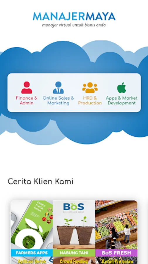 ManajerMaya akan membantu anda menumbuhkan bisnis anda, melakukan seluruh pekerjaan manajemen bisnis anda secara virtual dan digital, mengelola administrasi, keuangan, akuntansi, inventory stok, sumberdaya manusia, payroll, customer support, sales marketing, social media support, online marketing, strategi digital, business planning, dan masing banyak lagi fitur pekerjaan manajerial lainnya.