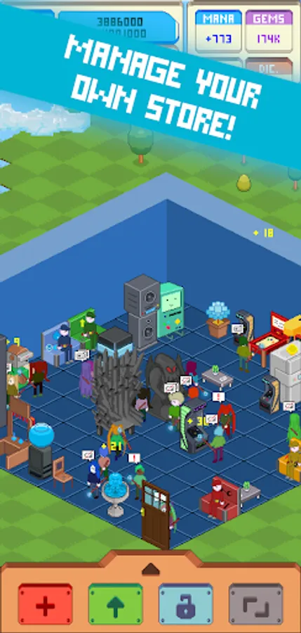 Purchase machines and employees to generate mana for you, and use it to open your very own store.