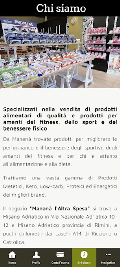 The physical store "Mananà l'Altra Spesa" is located in Misano Adriatico in Via Nazionale Adriatica 10-12 in Misano Adriatico in the province of Rimini, a few kilometers from the A14 toll booths of Riccione or Cattolica.