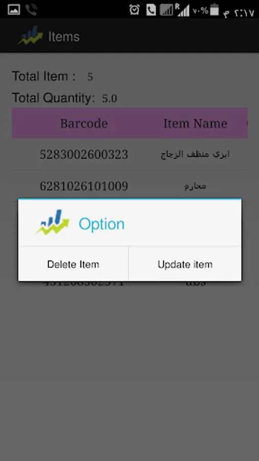 Easy to show all items that have been inventoried as it shows the number and the quantity and price of each item and barcode, and is also delete or modify any items found in the inventory file by pressing a lengthy on the item name.