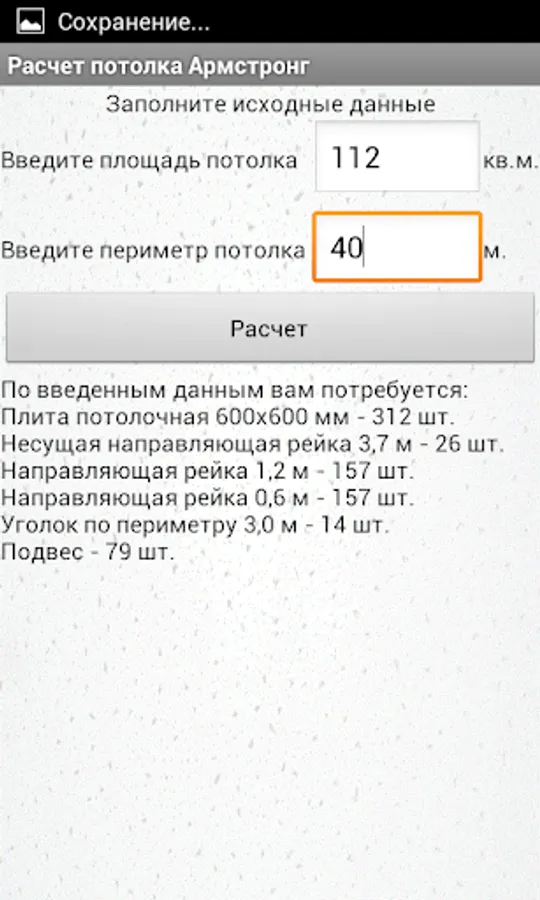 The program allows you to calculate the material for the installation of the ceiling Armstrong, for a given area and perimeter of the room.