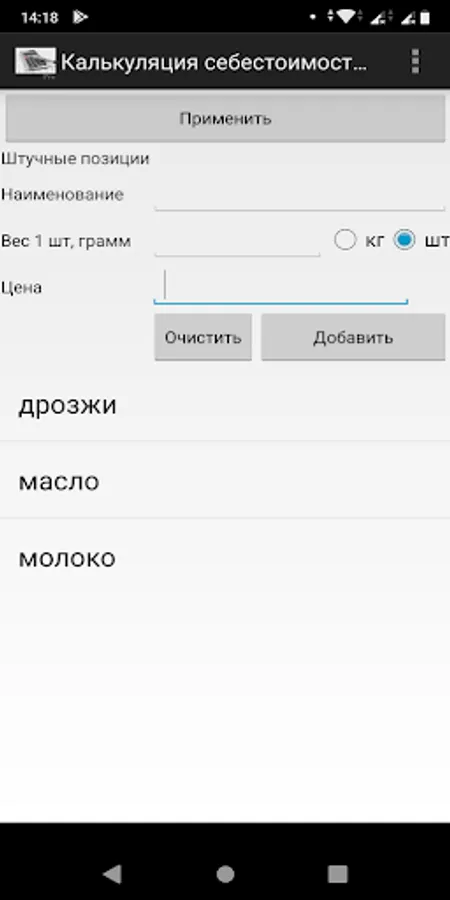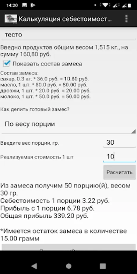 In the settings you can set the option of indicating the cost of the input ingredients, specify the currency to display, add permanent positions (weight and piece).