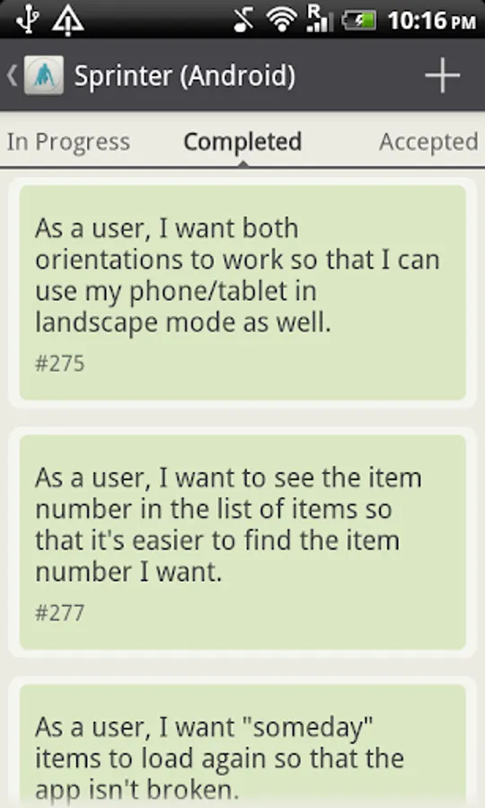 The Sprinter app contains most of the functionality you would need to manage your Sprintly products. You can view items in any of the 5 statuses (Someday, Backlog, In Progress, Completed, and Accepted). You can add, edit, assign, score, favourite and comment on items. You can view (image) attachments. You can see markdown formatted text, and emoji.