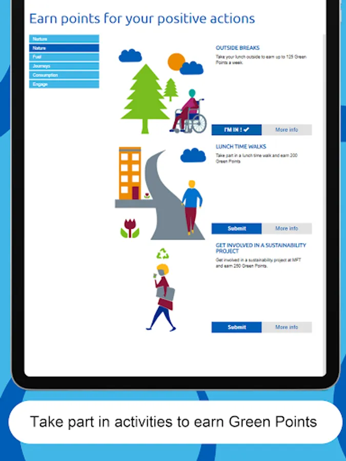This app is the companion for the Green Rewards programme, designed to encourage staff to take positive actions that improve sustainability and wellbeing.