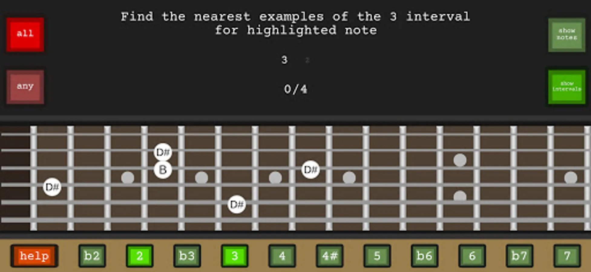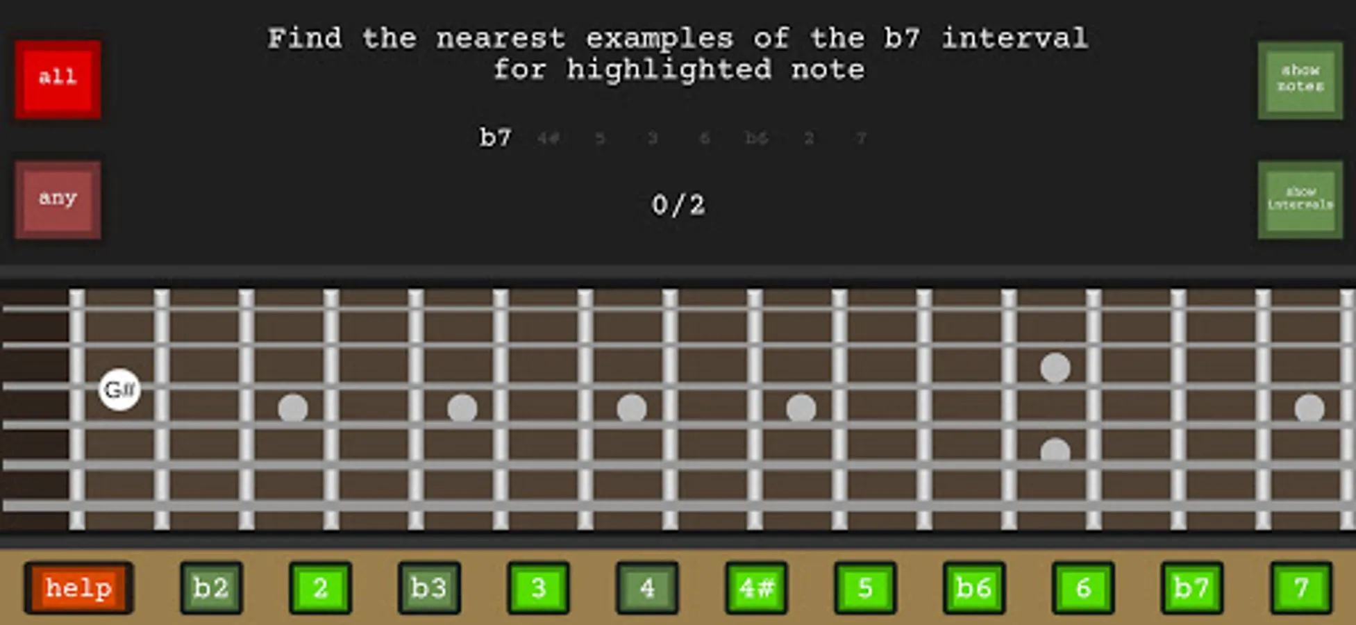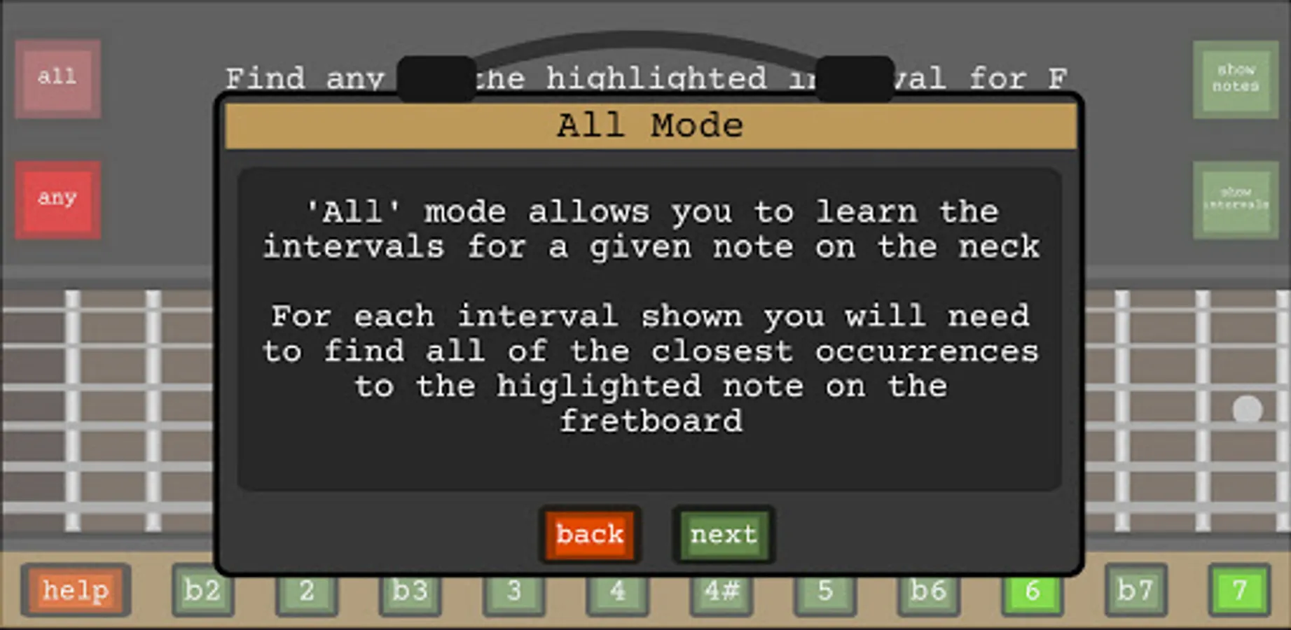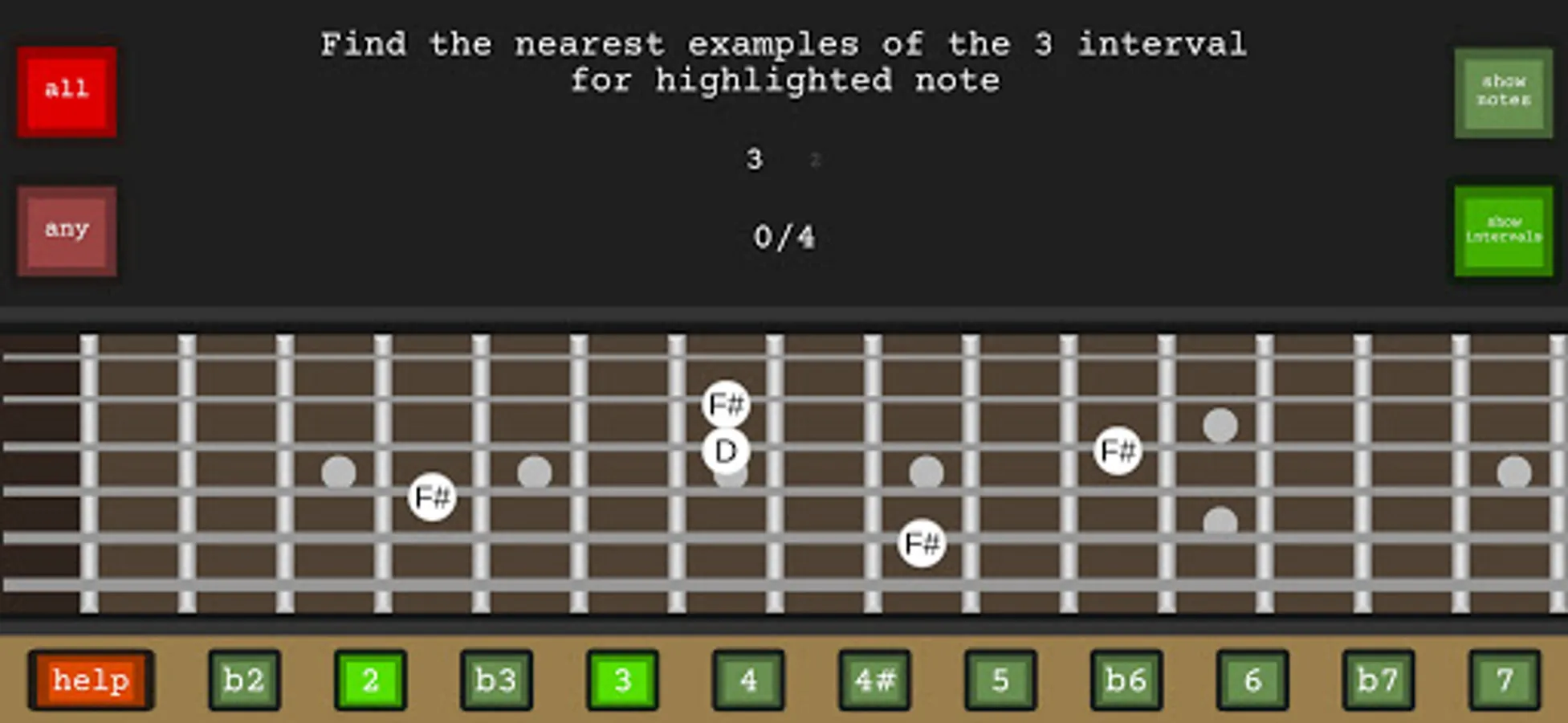 For example if you want to practice finding your "Seconds" and "Fiths" 'All' mode will pick a random note on the fretboard and ask you to find each occurrence.