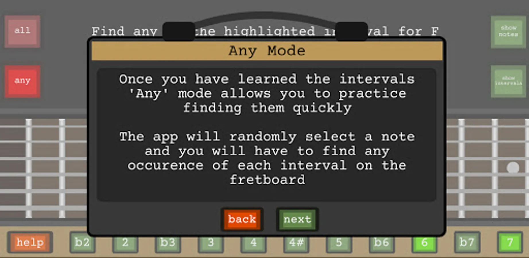 'All' mode is designed to help you learn and memorise the intervals shapes. The app will randomly choses a note on the fretboard and asks you to find all the surrounding interval positions from your selected practice intervals.