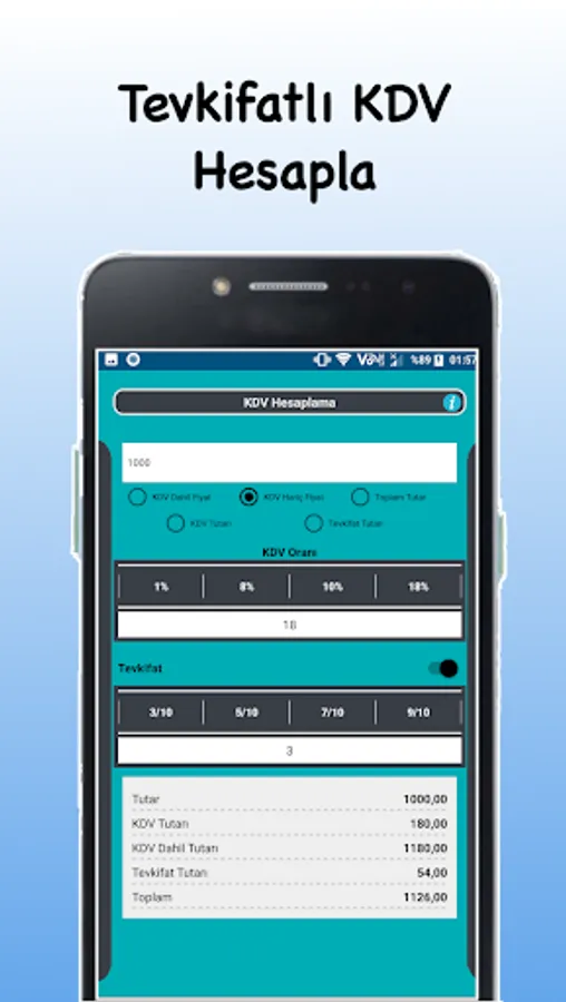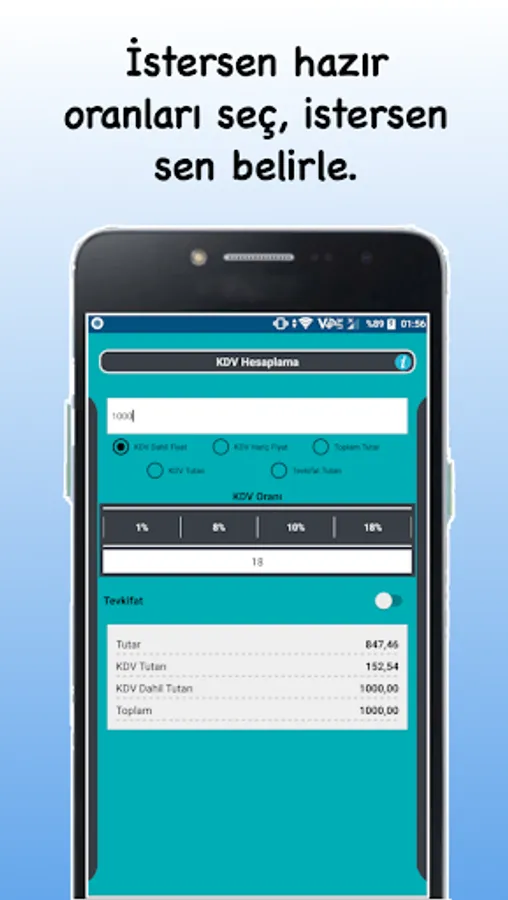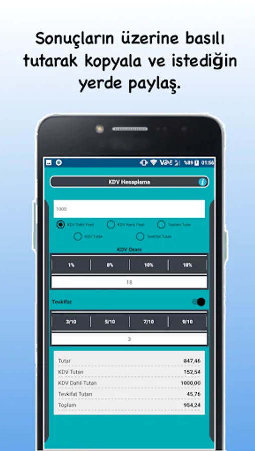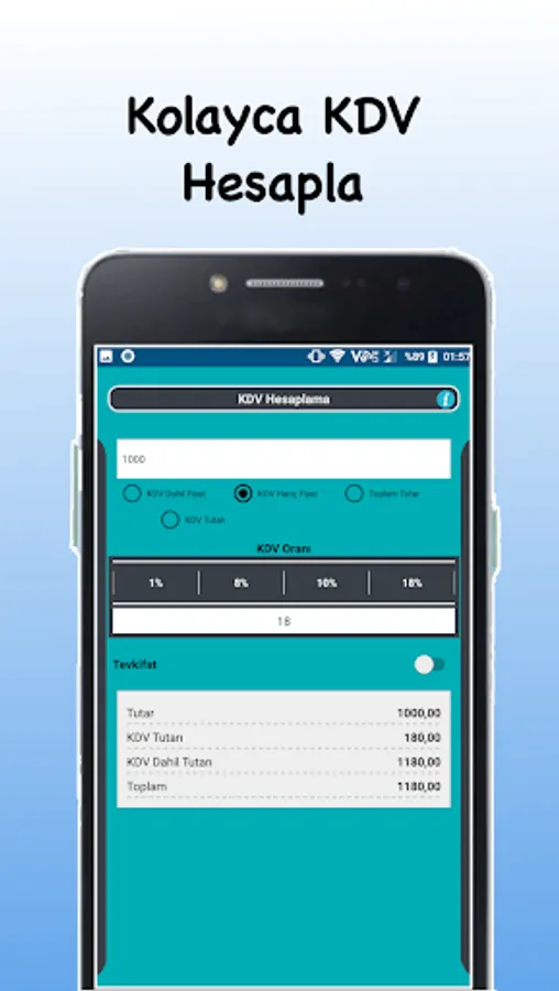 It is a very practical, easy and simple application where especially those who use invoices can easily calculate VAT (Value Added Tax), which takes their time. Enter the amount, determine the VAT rate. You can see the VAT Included, VAT Excluded and Deduction Amount information of the entered amount together.