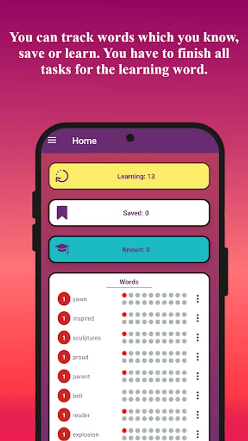 📚 Vast Vocabulary: Build a rich vocabulary with our extensive word bank, complete with audio pronunciations. Also you can save custom words to the app and app will help you to practice.