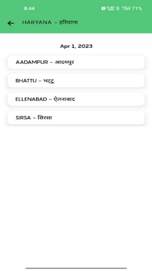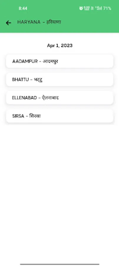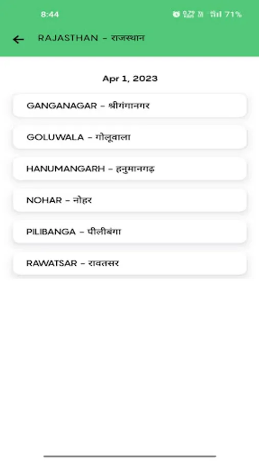 NOHAR , RAWATSAR , BHADRA , SRIGANGANAGAR , SRI VIJYANAGAR , BARAN , KOTA , GOLUWALA , PILIBANGA , HANUMANGARH. {RAJ}