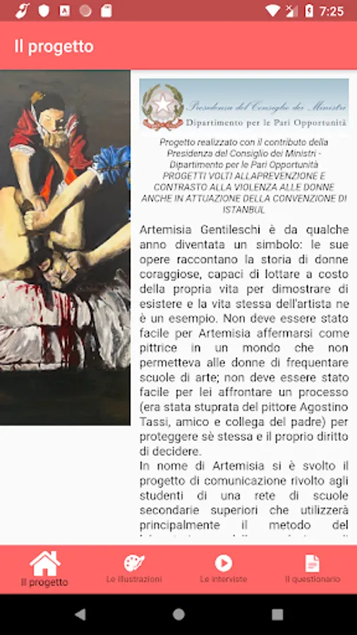 In the name of Artemisia, a communication project was carried out aimed at students of a network of upper secondary schools who will mainly use the laboratory and content production method, a project carried out by Mandragola Editrice and the Associazione A Mano Disarmata, funded by the Department for the Equal Opportunities of the Presidency of the Council.