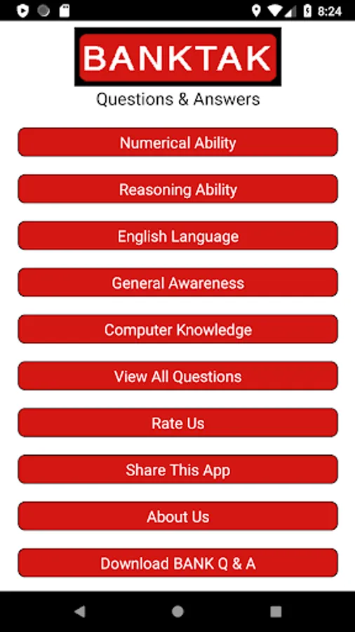 BANKTAK Helps people to crack the exam conducted by banks,Lot of people in India are preparing for BANK exam, for them this application can be useful, this app contain previous year & some related question they can find them easily. It contain question almost in every pattern for the exam.
