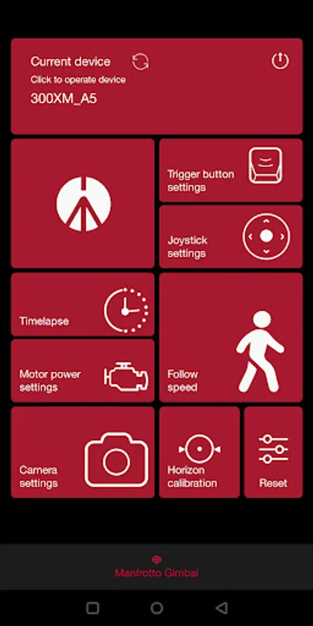 Manfrotto Gimbal 300XM App is developed for Manfrotto Gimbal MVG300XM designed for DSLR and mirrorless cameras. You can perform remote control, parameter configuration, firmware update, and so on.