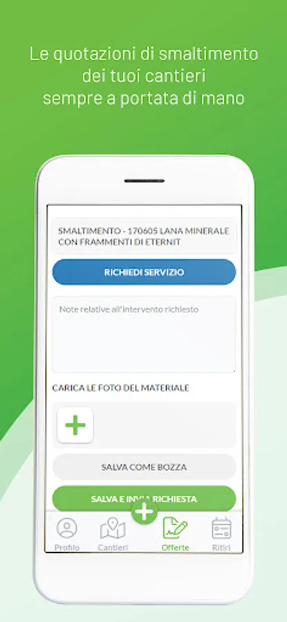 Mangiamianto allows you to formulate requests for offers, always have the disposal quotations of your construction sites at your fingertips, manage product collections directly from the construction site; you will have direct and immediate contact with our offices.