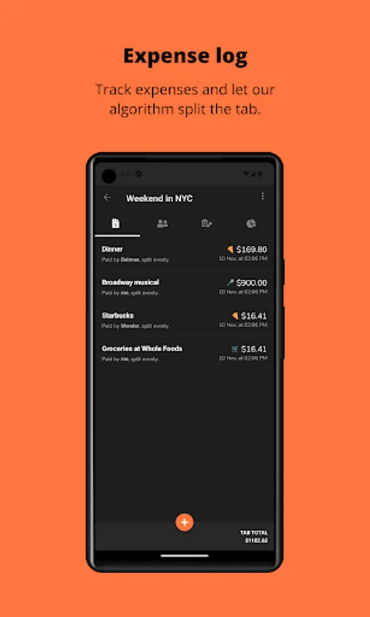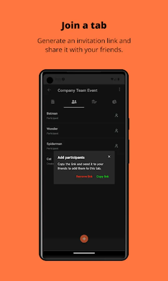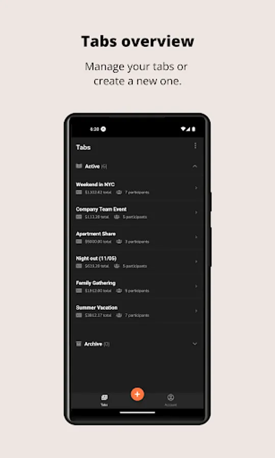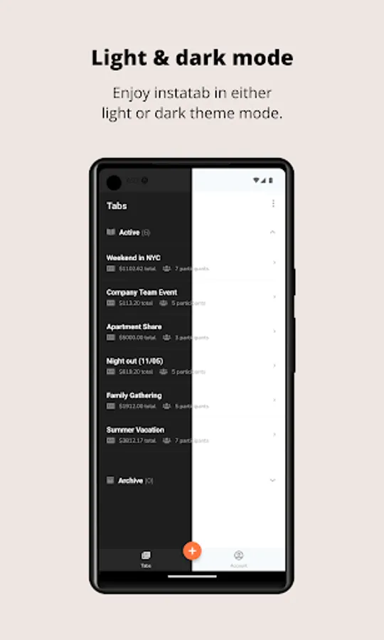 instatab is a free and user-friendly app that makes tracking and splitting expenses with friends and family effortless. No more trying to keep track of who owes what, or figuring out how to split expenses - instatab does all the work for you. Whether you're planning a trip with friends, going out for a group dinner, or simply want to keep track of shared expenses in a shared apartment or rental property, instatab is the perfect tool for you. With its advanced algorithm, instatab calculates the least amount of transactions needed to settle the tab, ensuring a stress-free experience for everyone involved.
