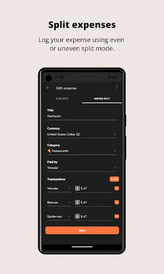 - Split expenses evenly or assign different amounts using the uneven mode.