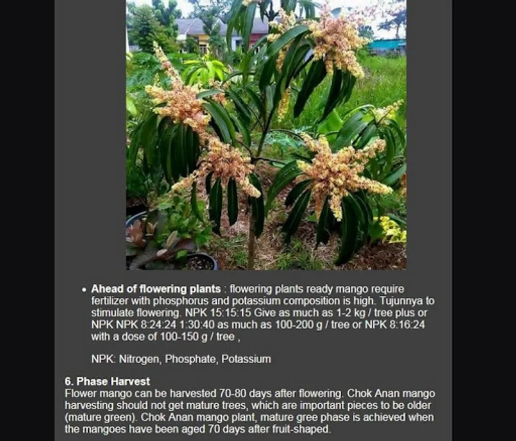 Mango fruit is also treated as sweets, dried fruit slices, canned and others. In various regions in Indonesia, mango (old or young) is often used as a mix sour sauce or fish and meat dishes. Mango plants including Anarcadiaceae parts, shaped tree with reaching 10-40 meters tall with stem diameters of around 80-100cm.