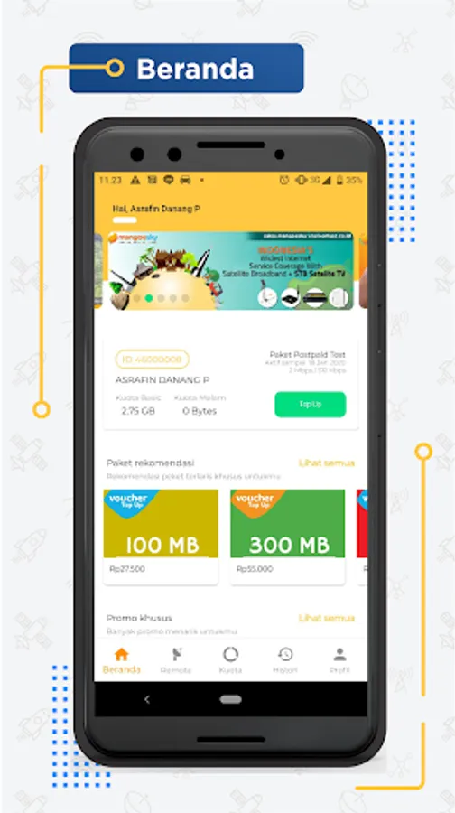 Mangoesky service is a high speed broadband internet services up to 2 Mbps using satellite technology. Mangoesky services intended to meet the needs of broadband: both residential and individuals, as well as supporting the middle to lower business (SME / SME). Mangoesky is the only broadband services via satellite in Indonesia, the rapid delivery capability and is able to reach out to remote areas. With download speeds up to 2 Mbps and uploads of 0.5 Mbps which will provide convenience for customers to access the data, for subscription customers are given 13 Channel FTA for free. In terms of technology the customer will get high-speed satellite technology (Ku-Band), which is supported by the latest devices and cangggih (Hughes), so performasi delivery via the Internet network will be stable, fast and secure. In terms of service, customers will be provided with high speed internet connectivity (Download up to 2 Mbps and upload 0.5 Mbps), it will provide convenience for customers to access the data (browsing). Aside from Internet connectivity, the customer will be given an additional device to enjoy several TV channels for free.