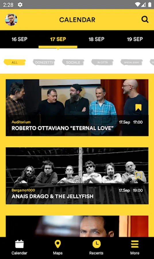 The Calendar function follows the events according to their temporal evolution. In this way you will be able to view all the appointments in a fluid and consequential manner, filter the daily programme by category and choose to delve into the event files with the possibility of purchasing the entrance ticket directly from your smartphone. A Map will keep you up to date on the events around you, so that you can find the nearest concert and easily navigate to the place of interest.