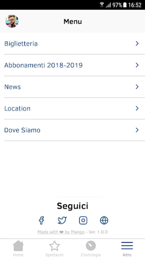 Through the History menu item you can keep track of the last tabs displayed and, finally, the application will allow the Teatro Giuditta Pasta sending Push Notifications with promotions, program changes and warnings, communicating in an ever more immediate with its audience by providing a more punctual service.