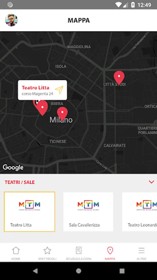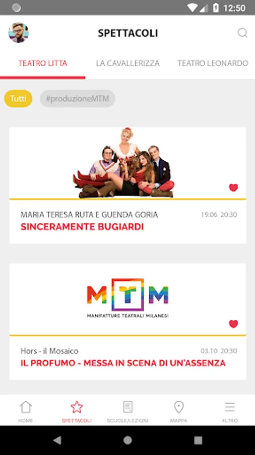 With the application of MTM - Manifatture Teatrali Milanesi you can quickly and easily consult the cards of all the shows in the season, staged in our rooms: Teatro Litta, La Cavallerizza, Teatro Leonardo.