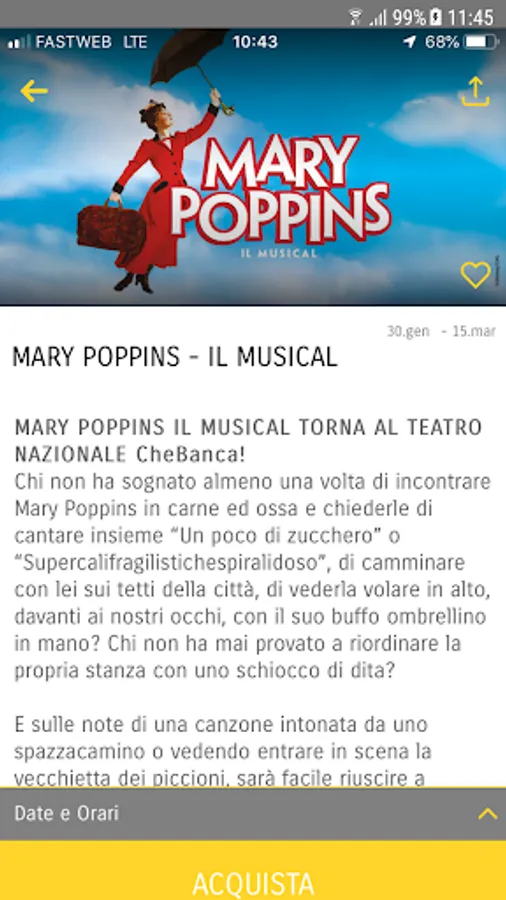 The new official application of the National Theater will allow you to have the theater always with you, just a click away! Download the App to access promotions and exclusive offers and to quickly consult the calendar with all the programming of musicals, shows and events of the Theater.